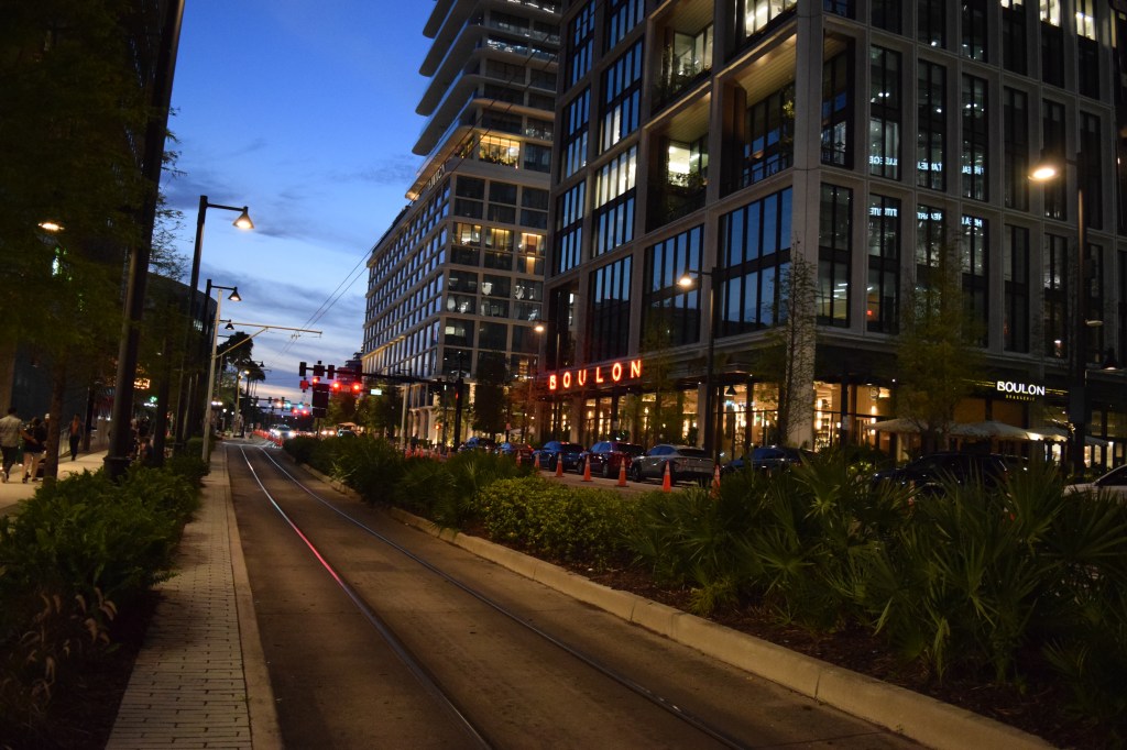 Tonight, I was out in Downtown Tampa, Water Street taking photos. I captured this photo of the Boulon restaurant sign just as it lit up at sunset. You can see the sky turning from blue to red off in the in the distance just as the sun went below the horizon. The street seems empty and calm with the TECO Line Streetcar nowhere in sight. I love the contrast of bright blue sky against the dark streets, while the buildings are coming alive with light and activity inside.